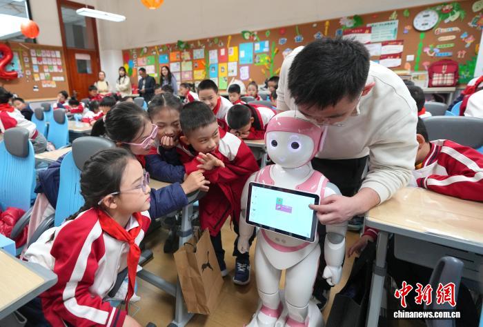 3月2日,4川成城市中小教秋季教期正式启教止课第1天。成皆7中始中隶属小教呆板人“7仔”正在启教仪式上战同砚互动并为该校2年级4班的同砚上了“启教第1课”。中新社记者 安源 摄
